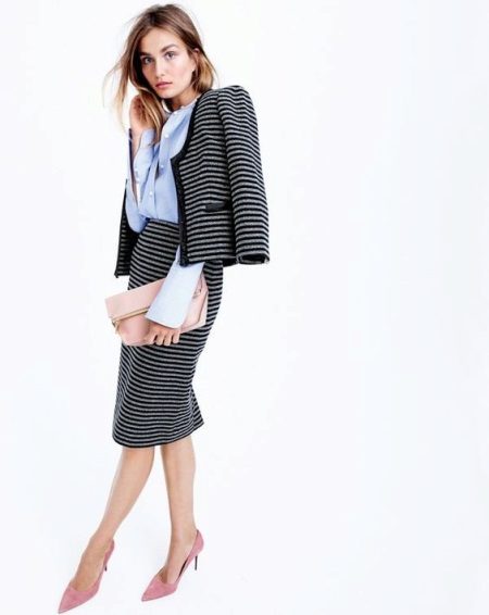- A great example of the fact that the strip is appropriate everywhere, even in a business wardrobe. Pencil skirt, jacket and blue shirt together look very interesting, but rather gray. They help to dilute the office look of the shoes and the clutch of pale pink color.
