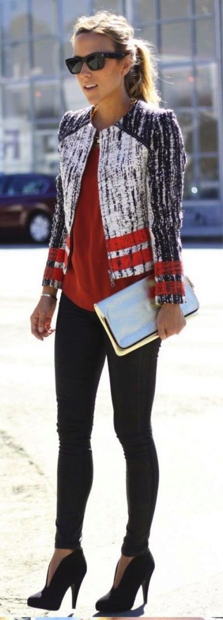 - A stylish look that fits every day. Skinny black jeans, a red top, a light clutch and a tricolor jacket with a zipper. Ankle boots with high heels can be replaced by shoes on a flat sole. Pay attention to the details that make the image complete: necklace, bracelets, sunglasses.