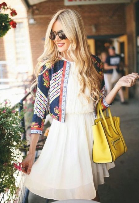 - An interesting image that is perfect for dating. Airy white dress, complemented by a cropped jacket with a colorful print. Look complementary sunglasses and a bright yellow bag. For this, along with pick up beautiful shoes with heels.