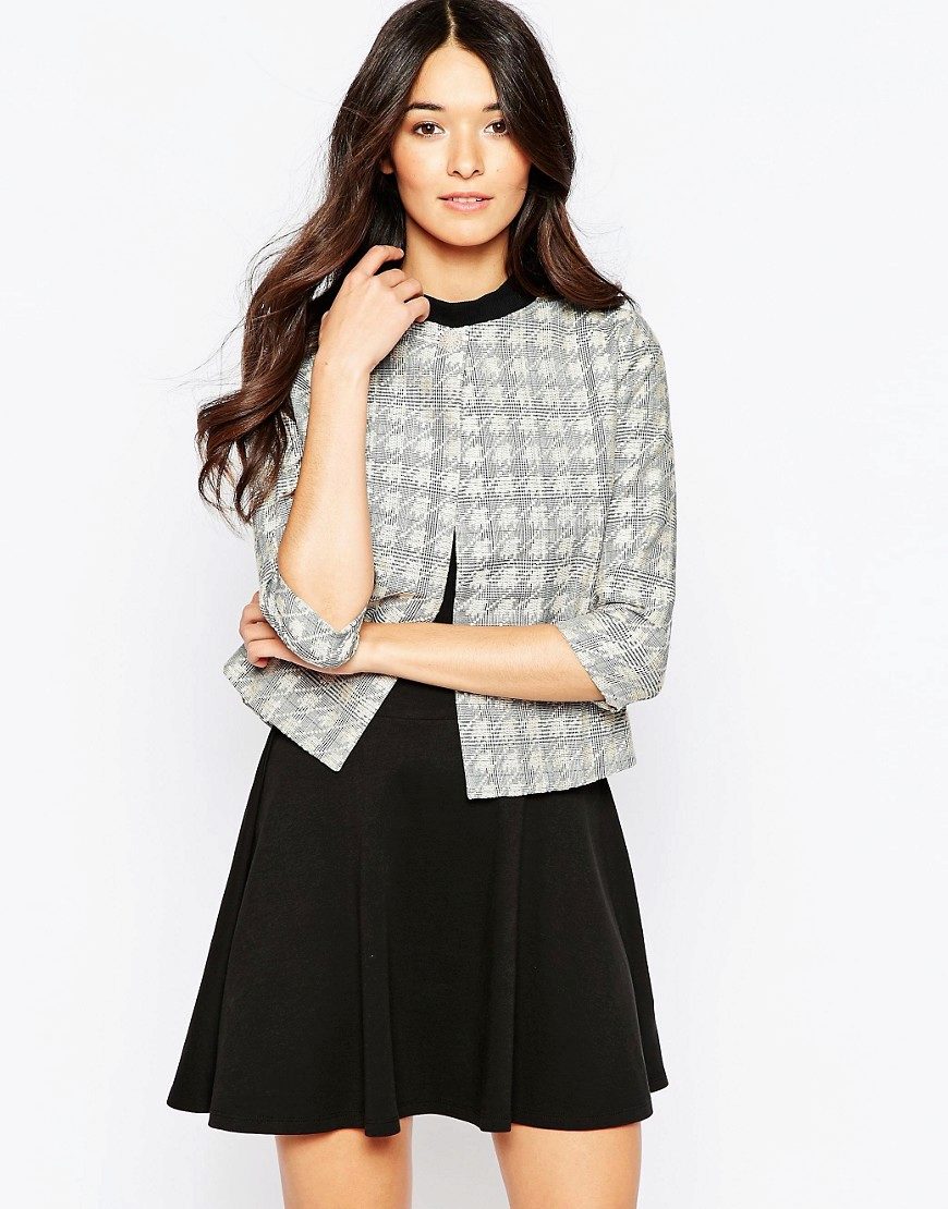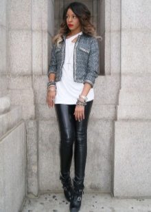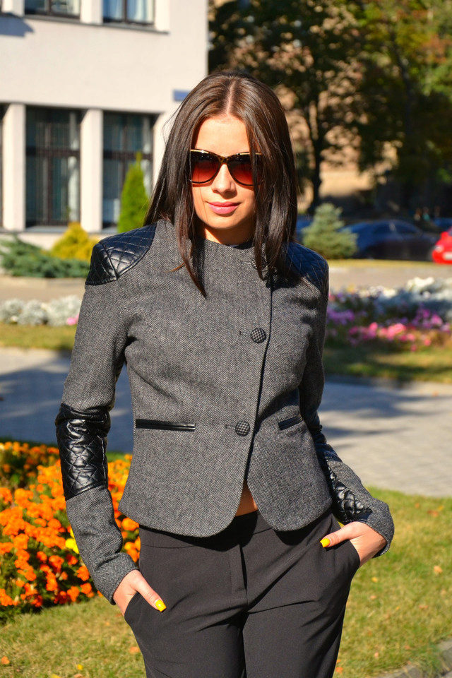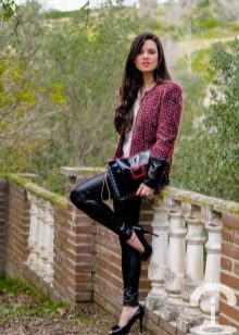 A cropped tweed jacket with leather inserts looks elegant. Large buttons, which are fastened diagonally, give the model a showiness. This jacket looks beautiful in a tandem with black fitting trousers.
