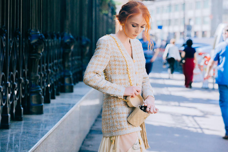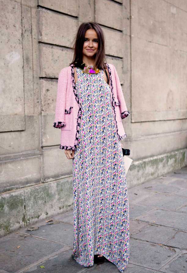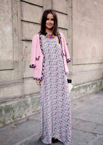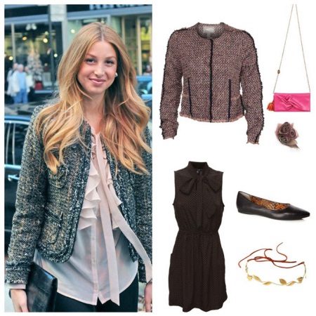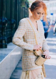 The combination of a shortened tweed jacket with a dress made of airy fabric looks gorgeous and romantic. Comfortable black ballet flats perfectly complement the irresistible bow. The dress can be decorated with a small flower ornament or with small polka dots.But a tweed jacket can combine several tones at once. Dim decorations and a small handbag on a chain will perfectly harmonize with the selected outfit.