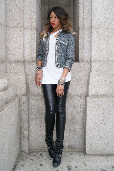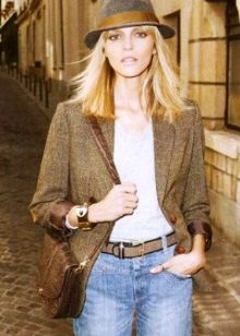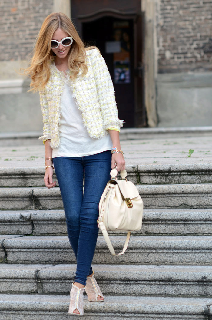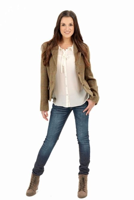 For casual bows, a tweed jacket should be worn with jeans and a snow-white blouse made of translucent airy fabric. Boots on the platform in the tone of the jacket perfectly complement the stylish image.
