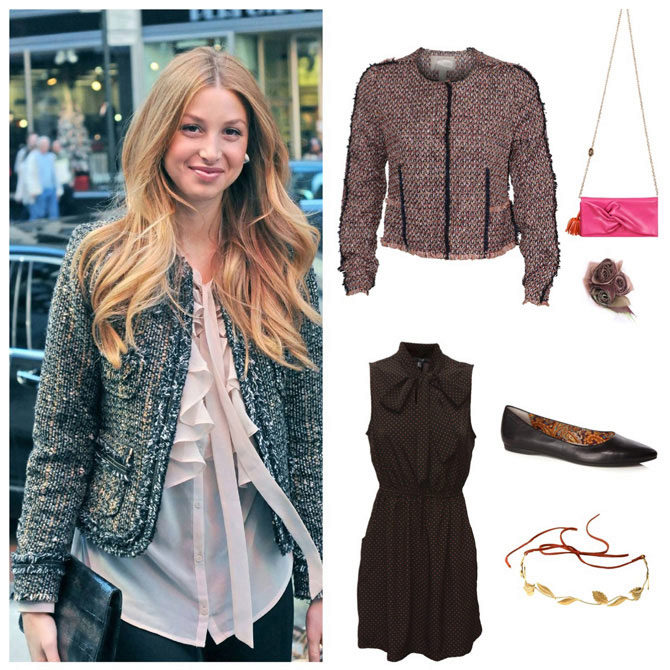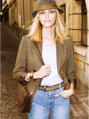 For an everyday look, you should wear a tweed jacket over a solid turtleneck or a thin sweater. Practical and comfortable jeans will be a great addition to a fashionable bow for every day.
