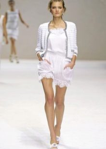 Taking the Chanel-style jacket as a basis, many fashion houses present in their collections shorter jackets, in which there is only two pockets on the chest and a round neck. Most often, such models are presented with short or short sleeves.