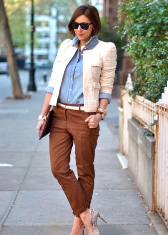 Jacket a la Chanel implies elegance and style. Therefore, we recommend wearing it in combination with classic shoes, shoes without heels, or shoes with heels. For autumn weather, choose ankle boots with a wide heel.