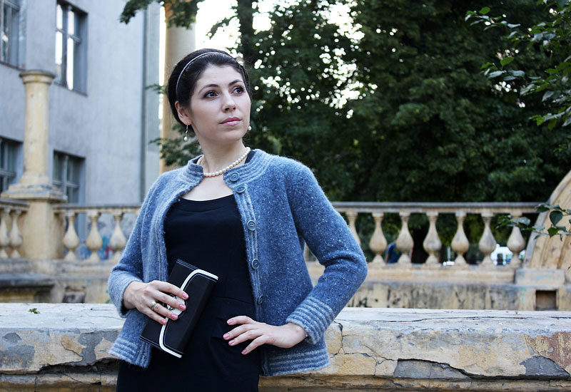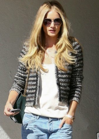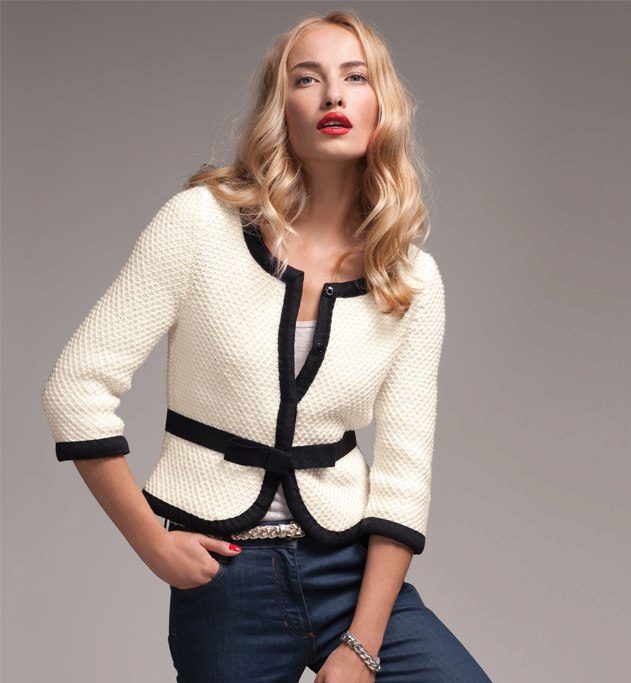 Knitted jacket in black and white with jeans look spectacular. Wear a silver bracelet and a belt with crystals to complete the look. So your casual style will become elegant.