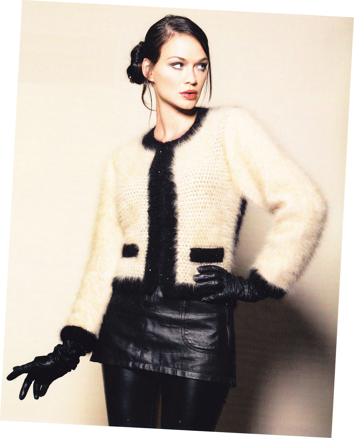 A smart solution would be a fur jacket a la Chanel with a sleeve. This jacket is better to wear with a big belt and leather gloves. To make your bow graceful and feminine, wear a metal bracelet over your gloves. Choose a bag from natural material, for example, from suede.