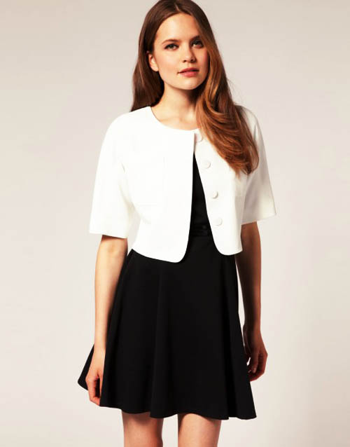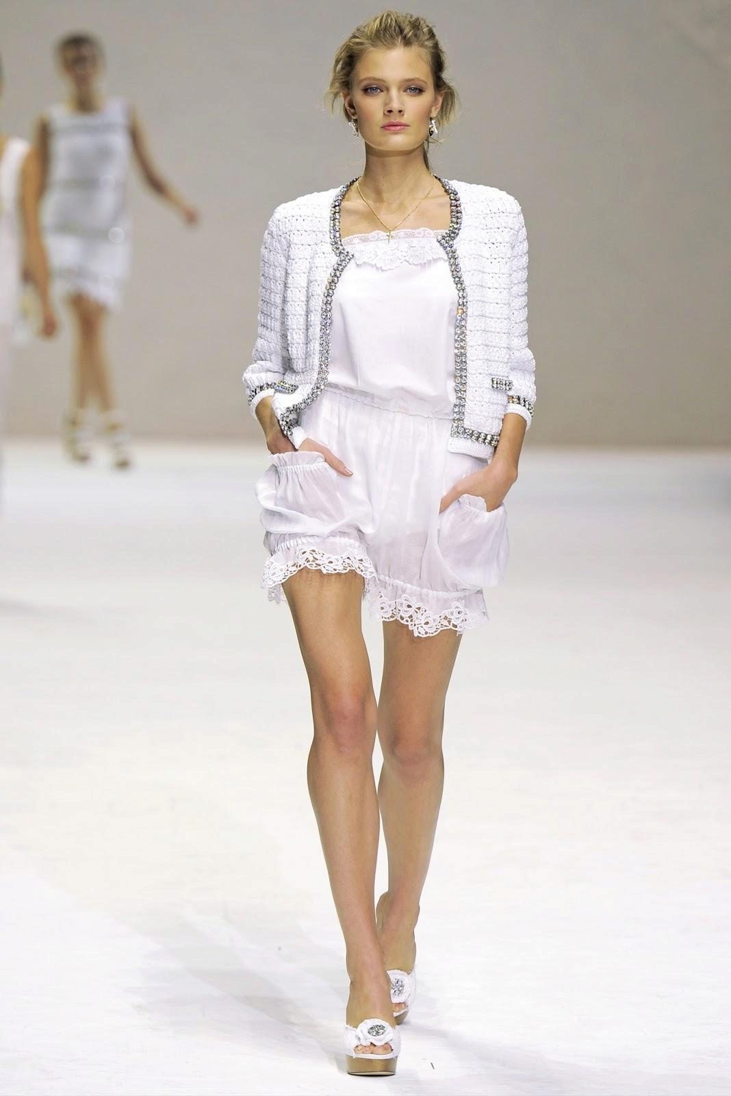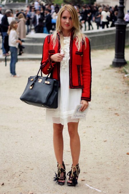 Total white look will help create a light white dress with ruffles and a classic jacket with a lock. Two gold button pockets remind you of Chanel style. Add a metal bracelet and high-heeled shoes to your bow.
