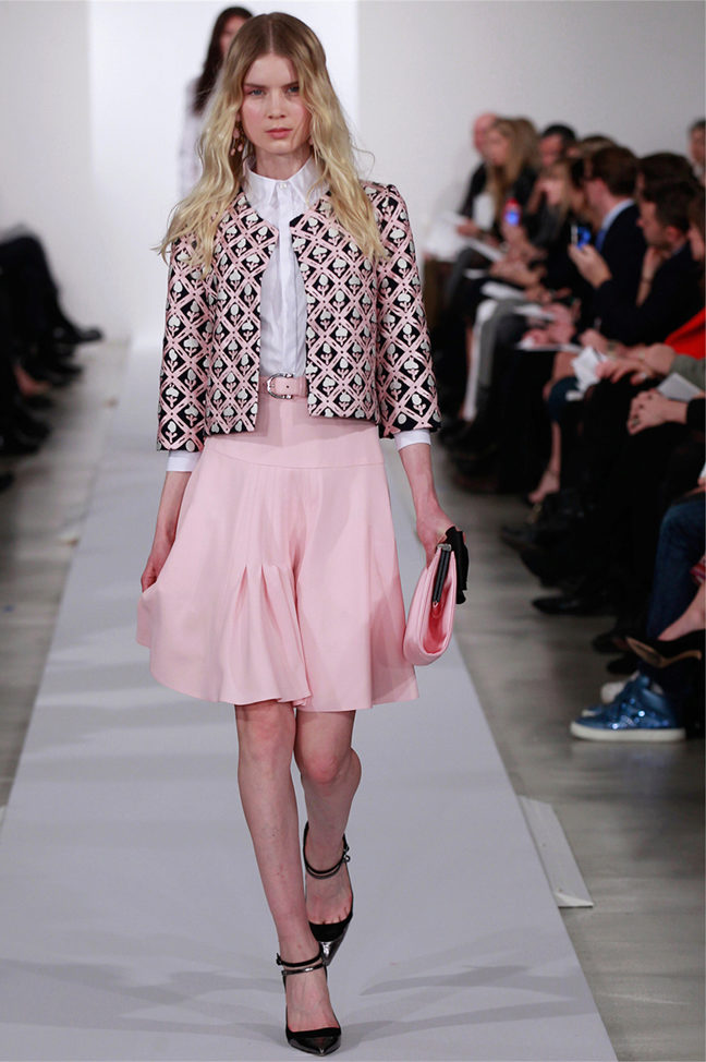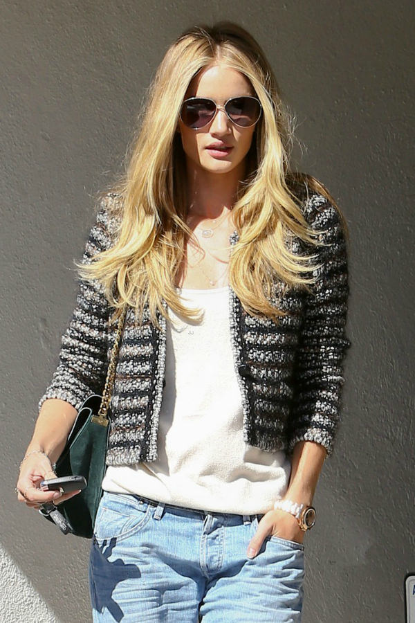 A romantic image will help create a pink jacket and a classic black skirt like Natalia Vodianova. Chunky heel booties and a beige leather handbag are the perfect complement to your look.