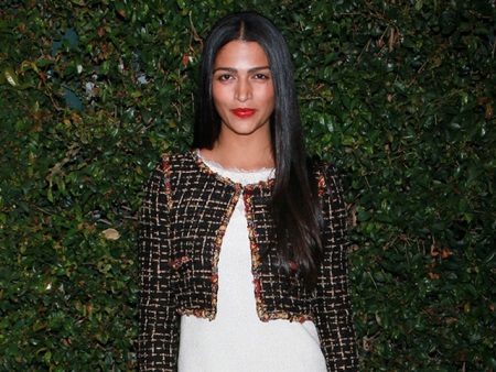 A bright jacket with a geometric finish, pumps with heels create a graceful bow on Cameron Sharp. As accessories, she chose a gold bracelet.