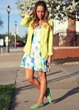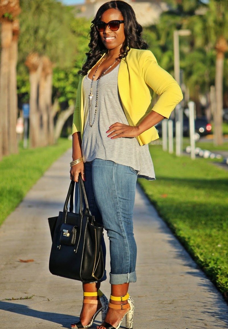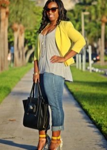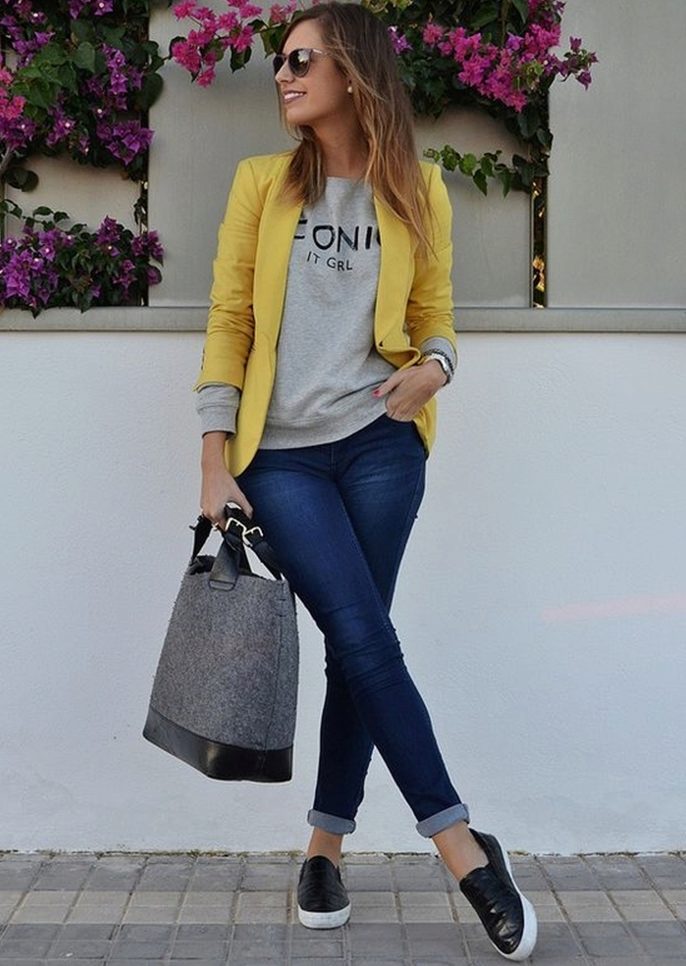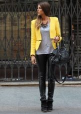 The jacket fits almost any clothing, be it a romantic blouse or a sleek top, dress pants or ripped jeans. Thinking through a set of clothes, it is important to focus on the harmonious combination of yellow with the other colors.