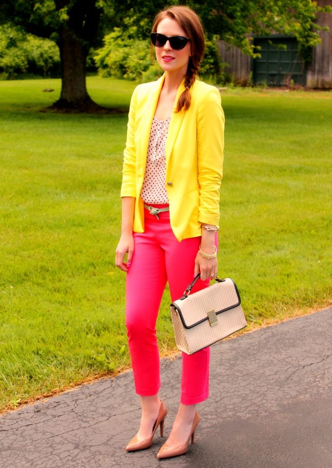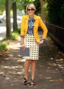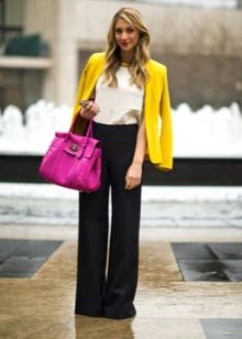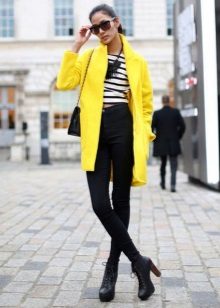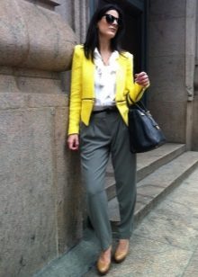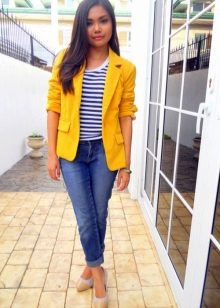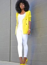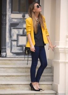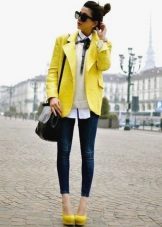 Choosing a suitable set of clothes, do not forget that a yellow jacket in any case will become an accent in a dress. Moreover, regardless of the color saturation. Therefore, the brighter and more intense the color of the jacket, the more restrained and calm should be the color scheme of the rest of the clothes.