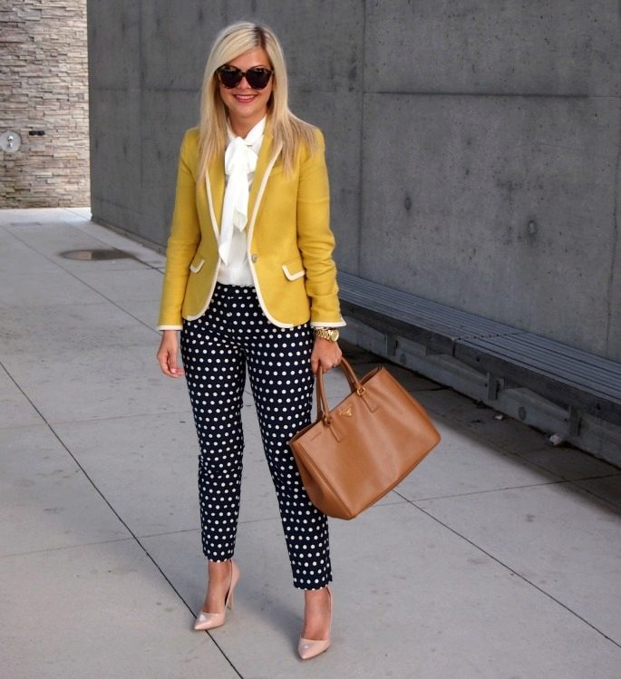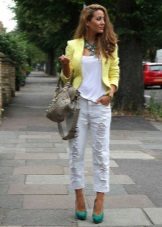 Stylish and elegant option for the office: a set of white top and tight pants + light yellow jacket with a basky and turn-down collar. Very modern and feminine bow.