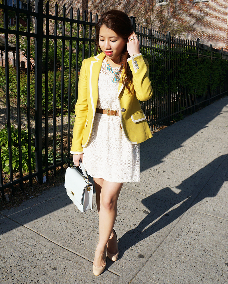 Romantic look for a young girl: light lace top + short fluffy skirt + sleek lemon-colored jacket with short sleeves. Great party outfit.