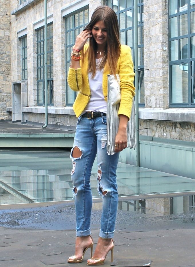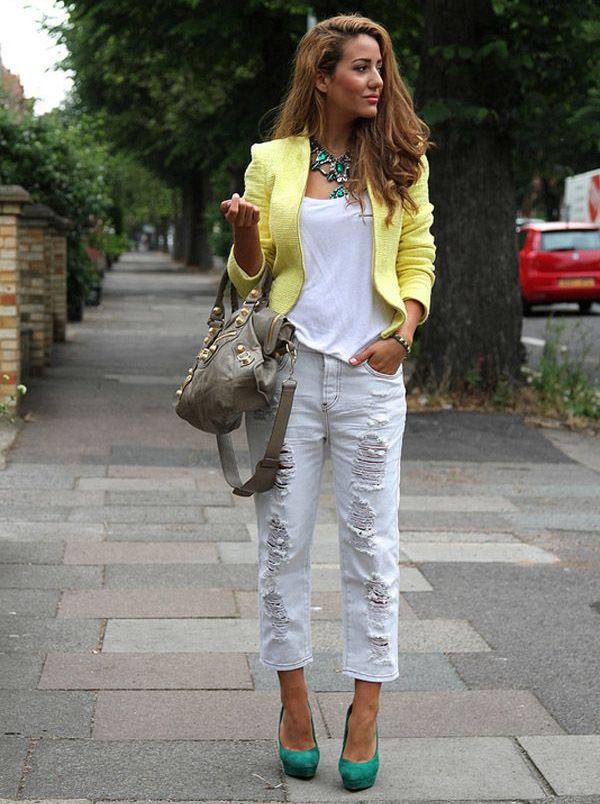 Youth style: rolled up ripped jeans + white T-shirt + fitted jacket in soft yellow color. A great option for walking around the city.