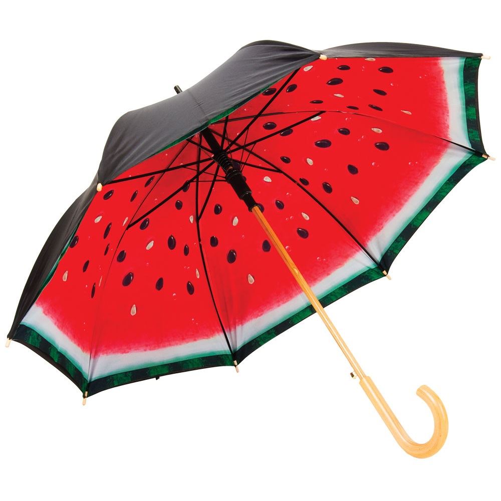 To set the mood on cloudy days, you can buy an umbrella with a juicy image of fruit in the section on the inside of the dome. Also, many models have a bright pattern on the outside, which others will appreciate. And some accessories drawings appear only when wet, and when the umbrella is dried, they disappear again.