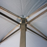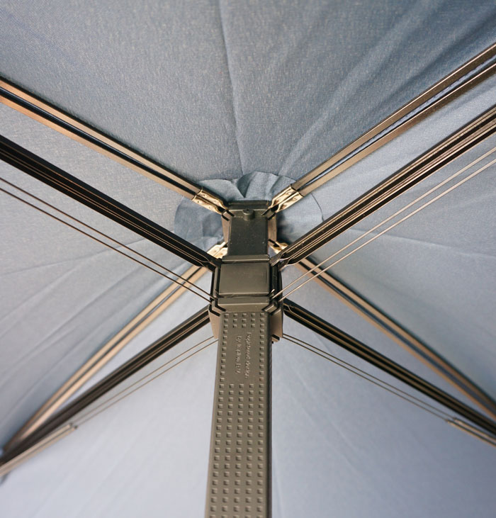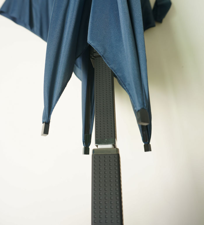 - High strength. Umbrella canvas consists of 4 triangular parts that form a square. Spokes are arranged in pairs along the diagonal seam lines, due to which the product acquires strength and resistance to bending even with strong gusts of wind.