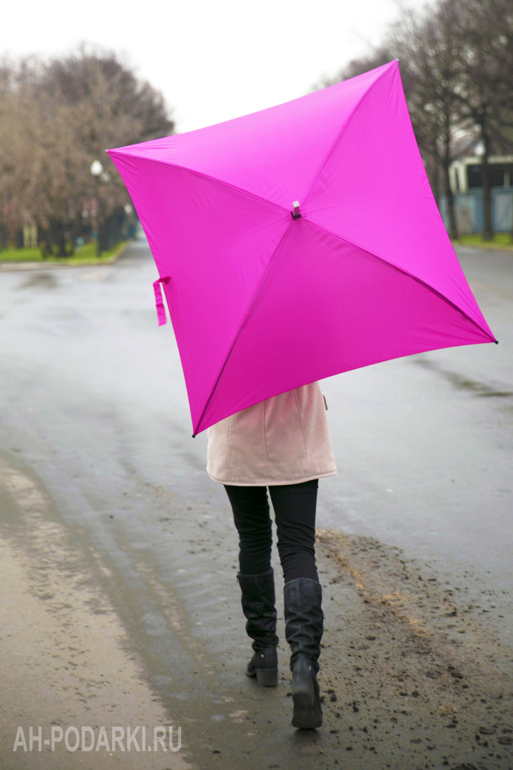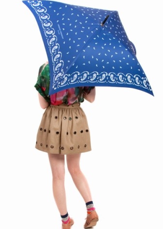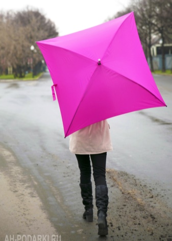 - Reliable rain protection. The square canvas has a large area, so one umbrella can wash 2-3 people from rain. In addition, the peculiar shape of the umbrella will provide additional protection for hands.