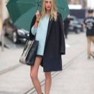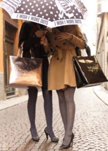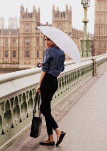 A gray umbrella with an abstract print will suitably fit in a city casual. It can complement the dress with a bright ornament and a blue raincoat knee-length. And if the style is more rigorous, you can wear a white blouse, black adjacent jacket, tight trousers with cuffs and classic shoes on a thin stiletto. In this case, you can pick up an umbrella to match the bag or shoes.