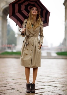 Choosing an umbrella with a print, you should not saturate the ensemble with an abundance of pattern. A single-colored short dress above the knee and a cloak of similar length with a simple pattern can approach this model.