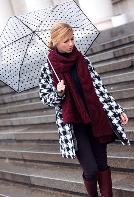 If you choose a model in a cage, you can wear plain, light-colored trousers, umbrellas and a bright jacket. Overlapping with shades of an umbrella can shoes or accessories.