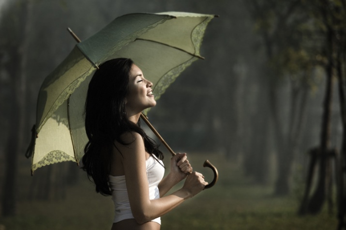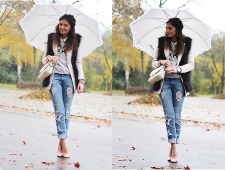 Want some classics? There is nothing simpler: a white blouse, light-colored trousers and a light cape go well with a black umbrella. You can pick up any shoes, and the bag should not be small.