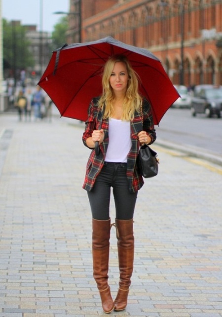 The double-domed red umbrella cane will be a harmonious addition to the bow, consisting of narrow black skinny, white jersey, red-black checked jacket and brown boots with a narrow shaft. As an accessory for this image a small black handbag is perfect.