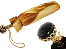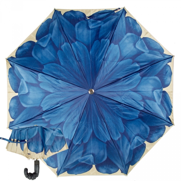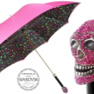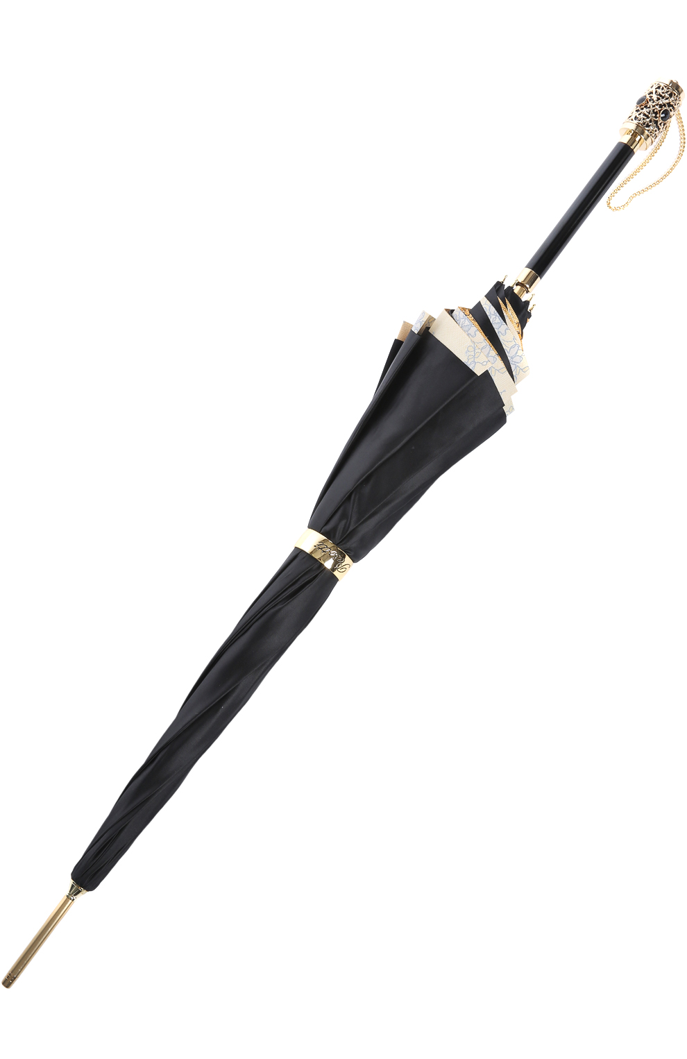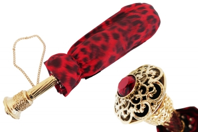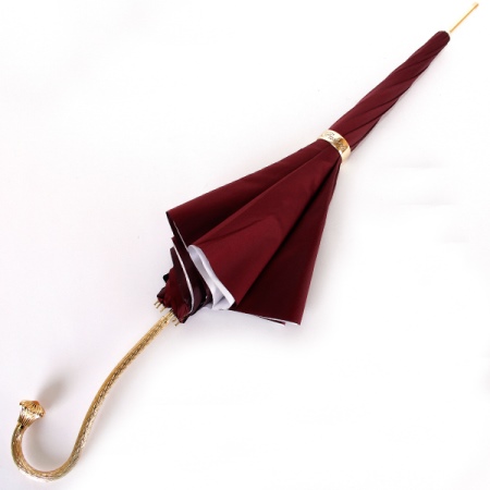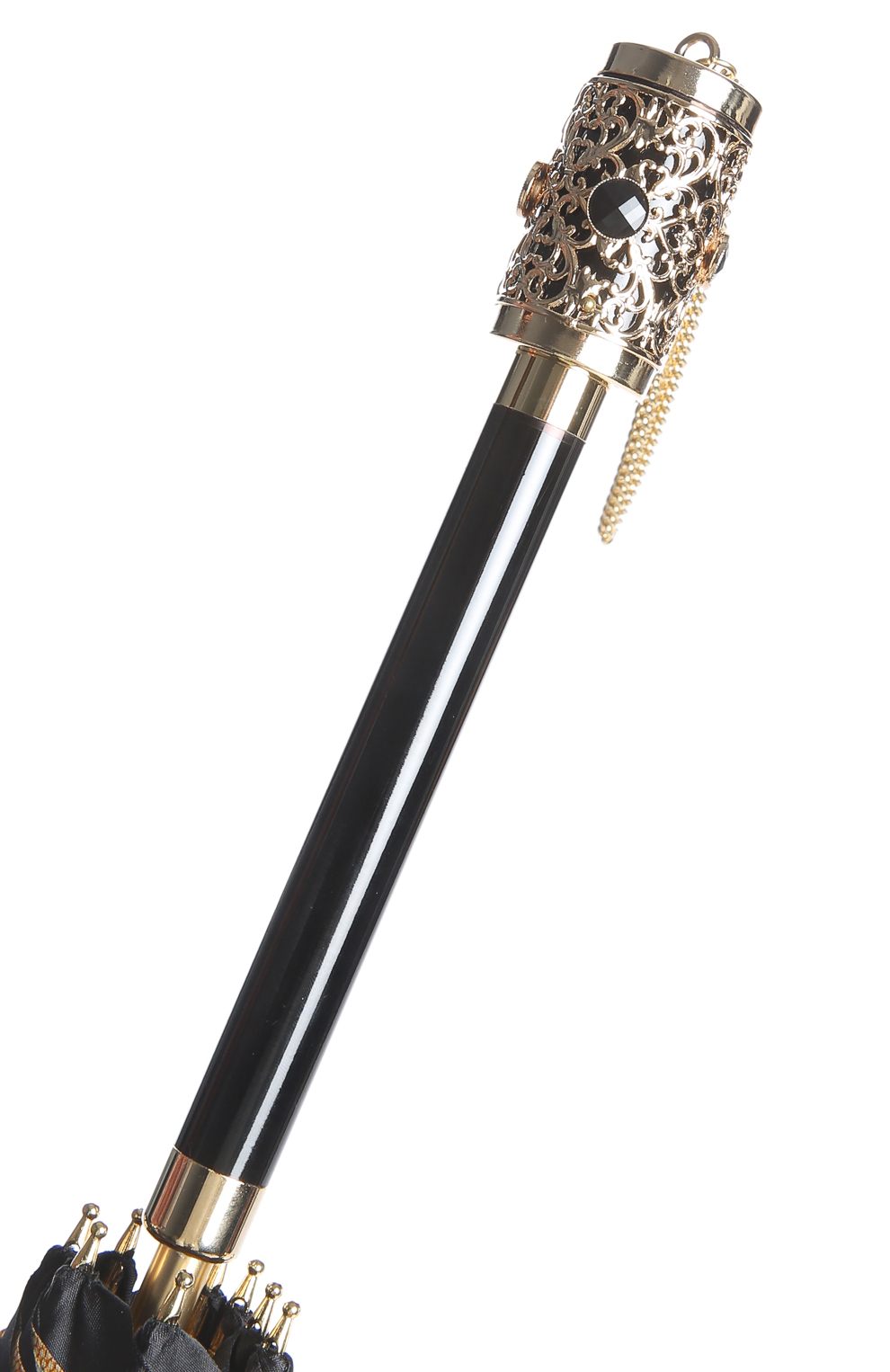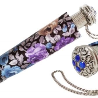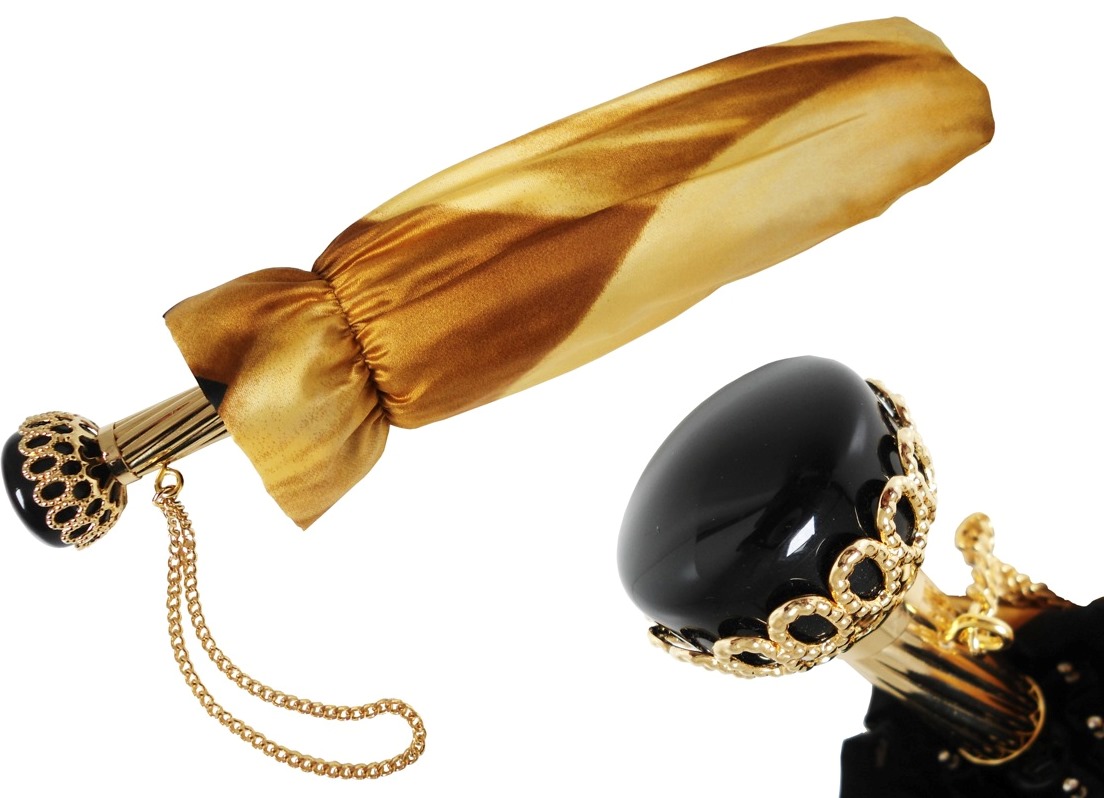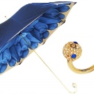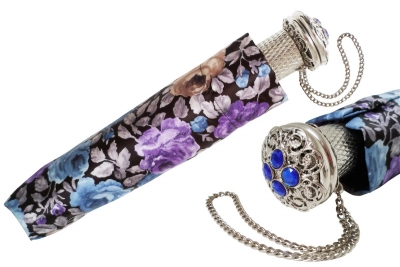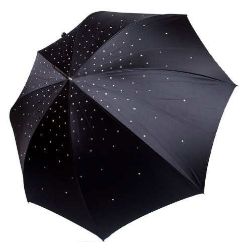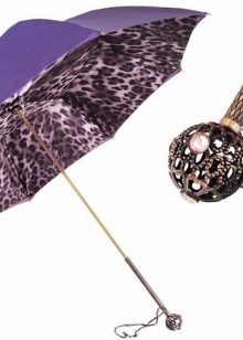 - The unique decor of the umbrella begins with the handle and ends with double-sided textile. At the same time, the handles of the models are often decorated with genuine leather, stones and sparkling Swarovski crystals, metallic elements of golden, silver color and jewelry compositions that represent gold-framed stones.