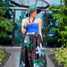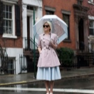 Retro-style: a fully transparent product with a thin edging around the edges - a strip of black or blue. You must choose a blue dress of strict style. A bandage is put on the head: a scarf or a scarf with polka dots. A bag and shoes of calm tones or, on the contrary, bright colors - a kind of accent.