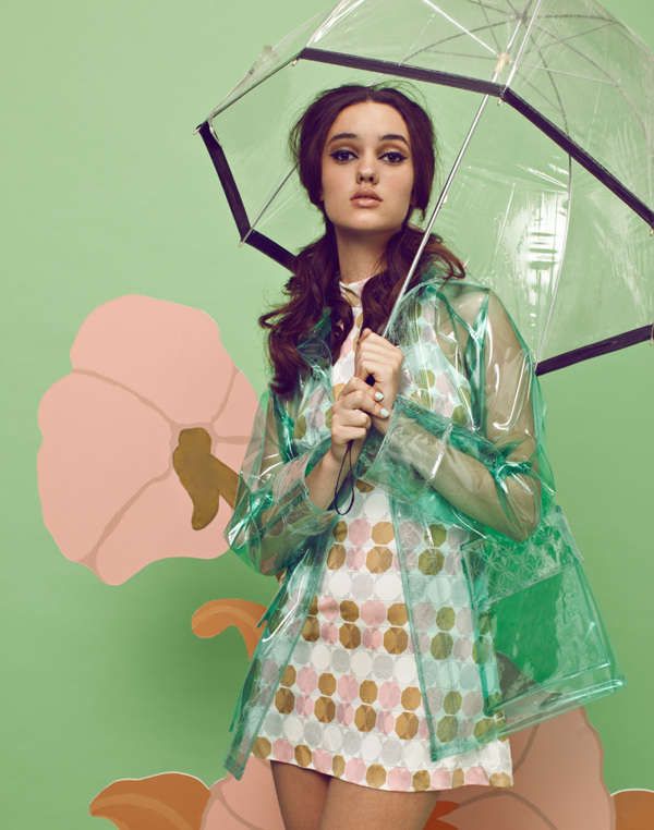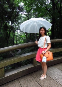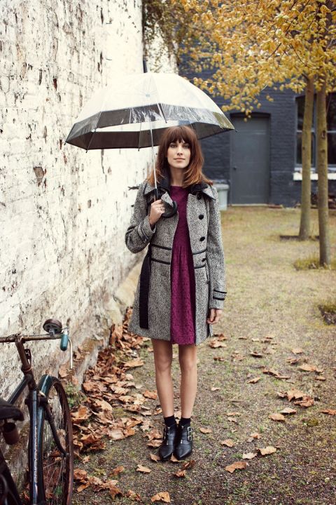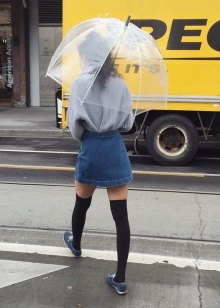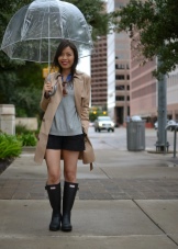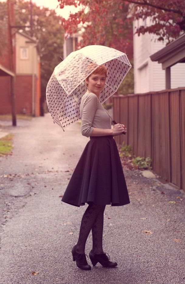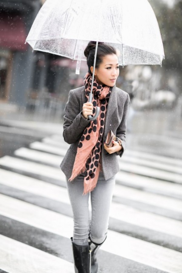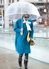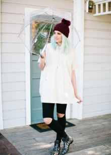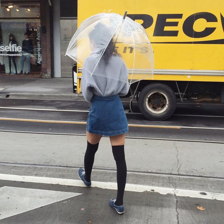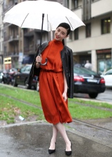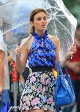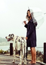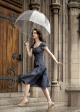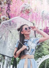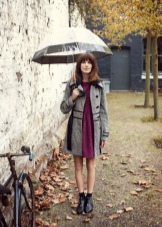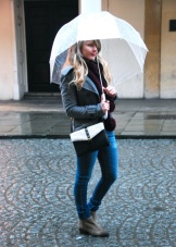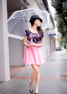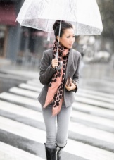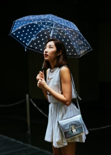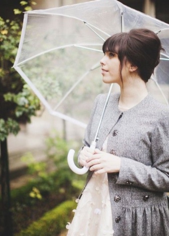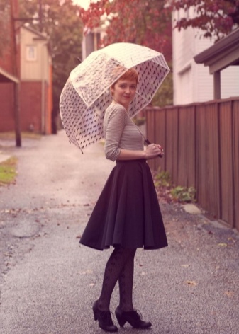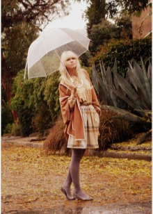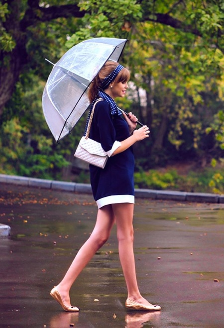 To create a feminine image, you can choose a transparent umbrella with romantic prints in the form of peas or hearts. It is better to choose clothes of light color: white skirt of A-silhouette, blouse with beautiful patterns. The handbag should be neutral shades, and shoes - on a thick sole or platform, which will not wet feet while walking in the rain.