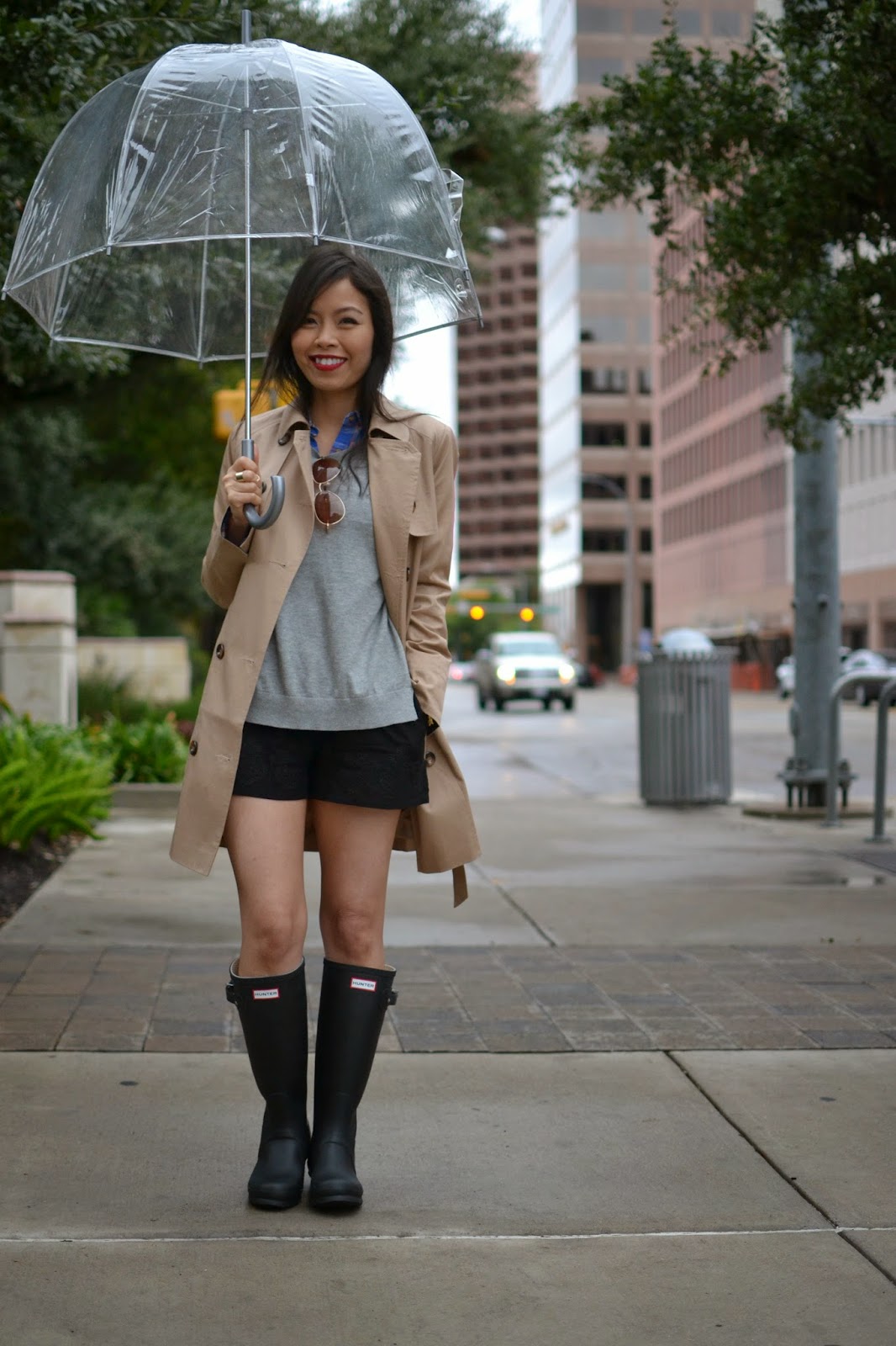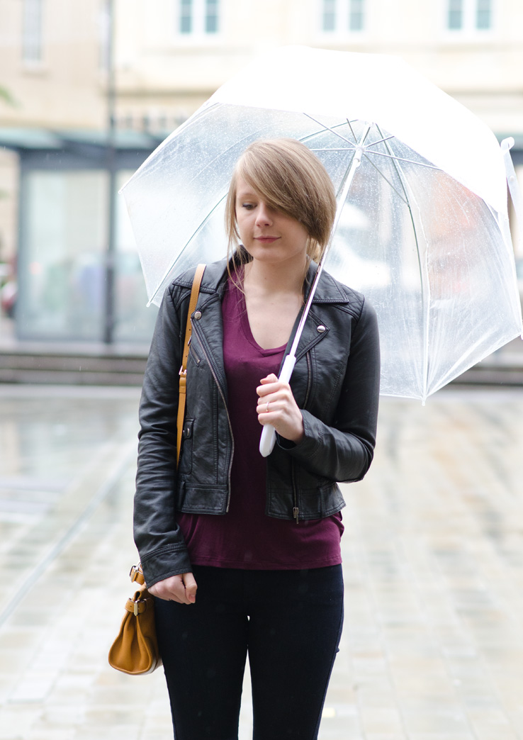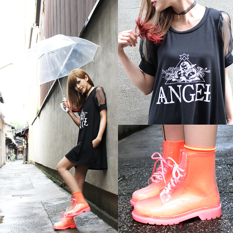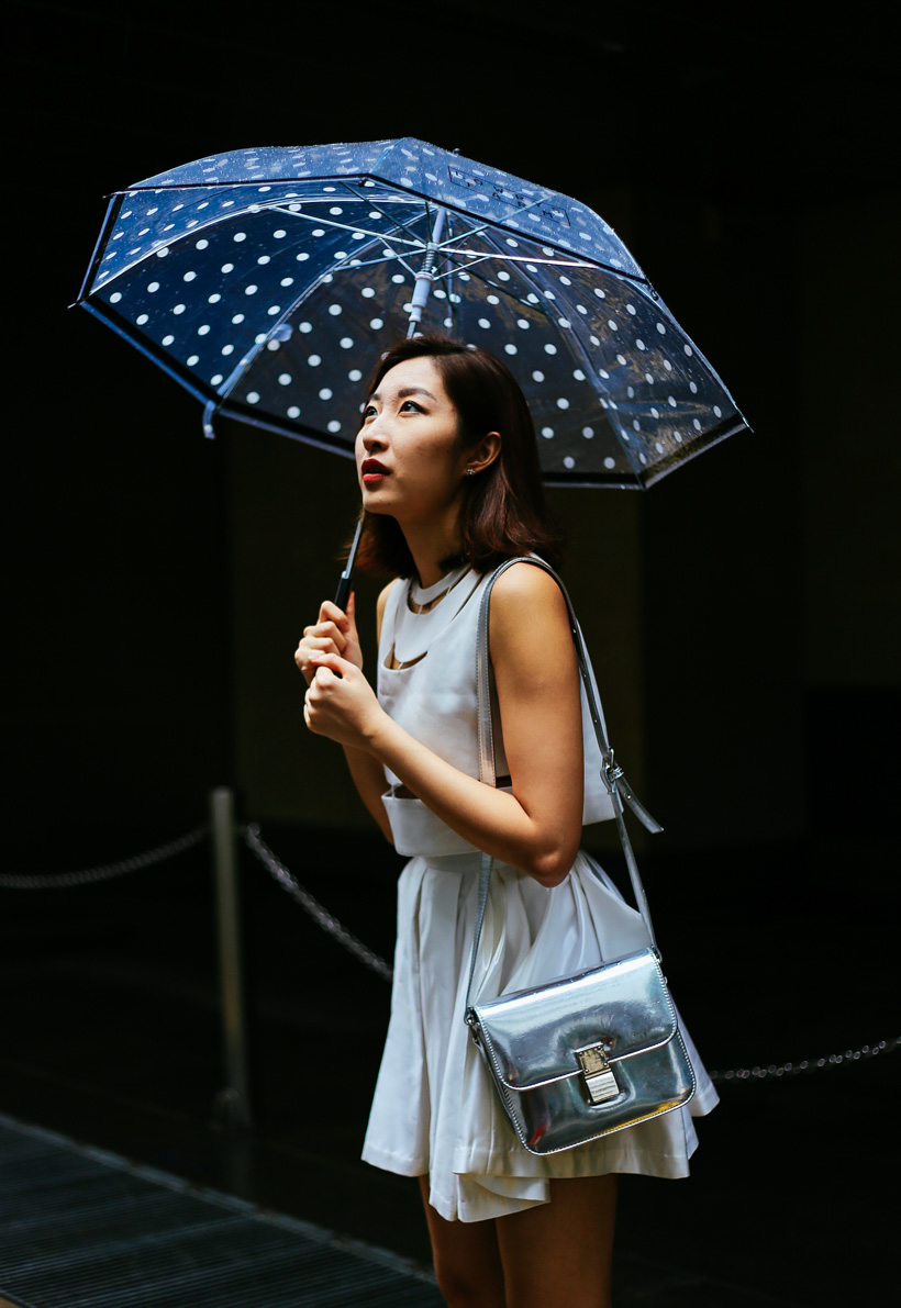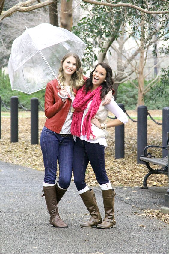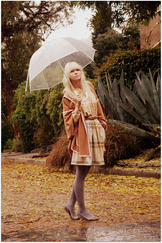 To create a feminine image, you can choose a transparent umbrella with romantic prints in the form of peas or hearts. It is better to choose clothes of light color: white skirt of A-silhouette, blouse with beautiful patterns. The handbag should be neutral shades, and shoes - on a thick sole or platform, which will not wet feet while walking in the rain.