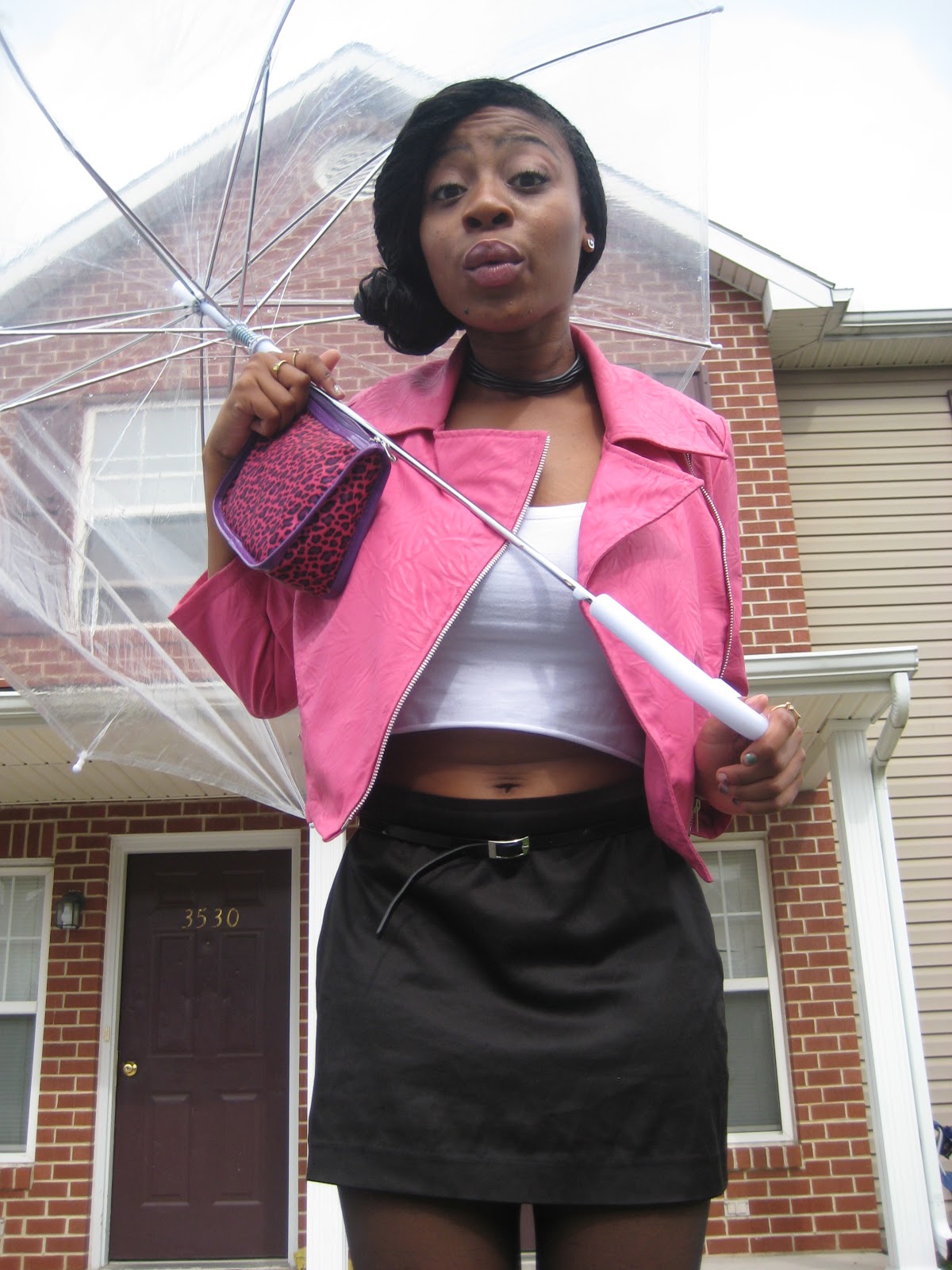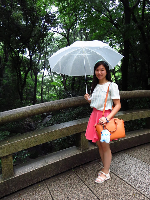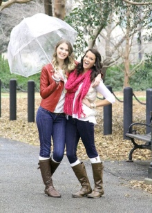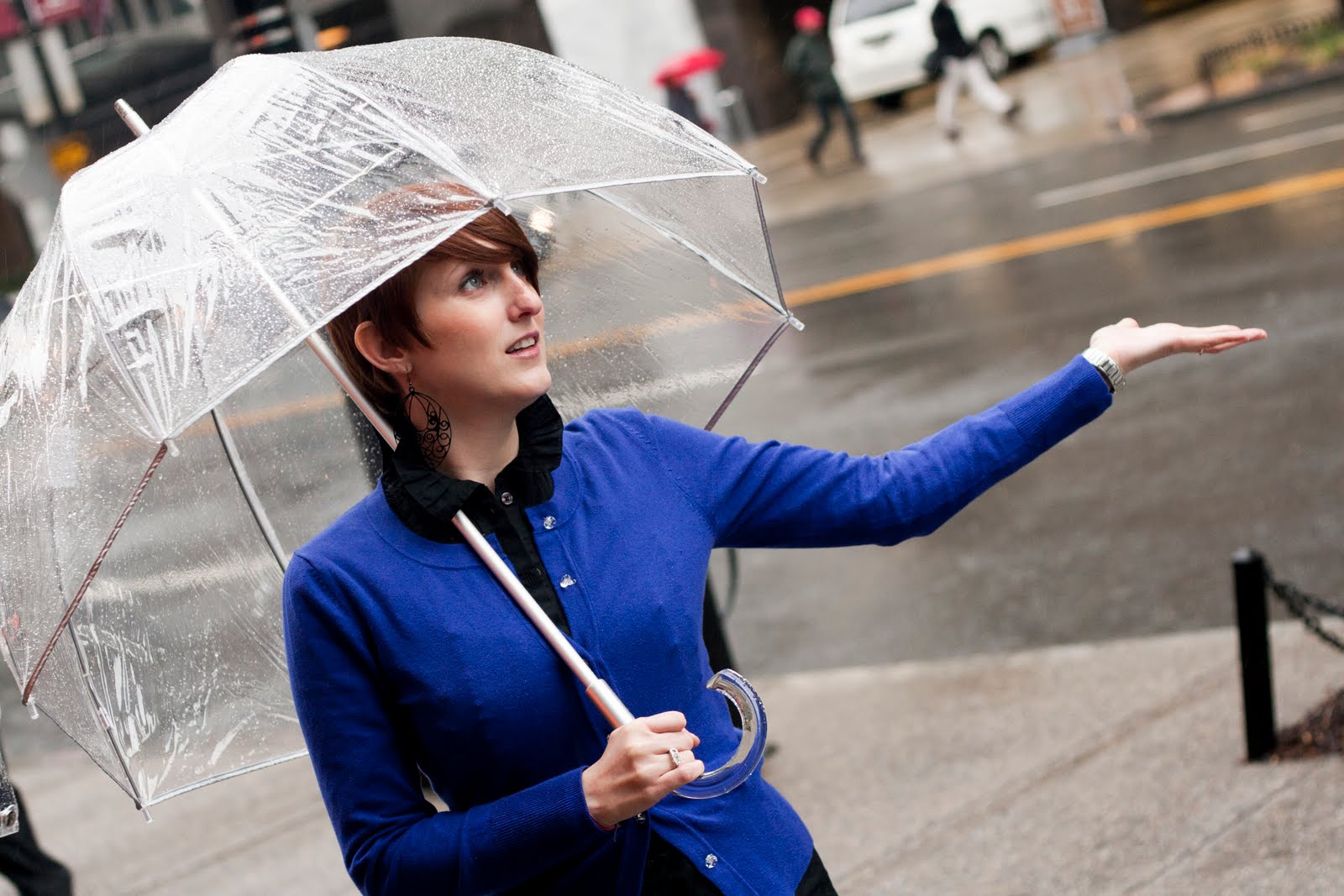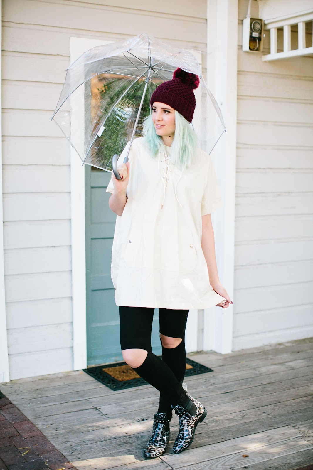 To create a feminine image, you can choose a transparent umbrella with romantic prints in the form of peas or hearts. It is better to choose clothes of light color: white skirt of A-silhouette, blouse with beautiful patterns. The handbag should be neutral shades, and shoes - on a thick sole or platform, which will not wet feet while walking in the rain.