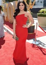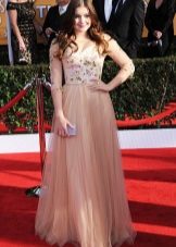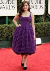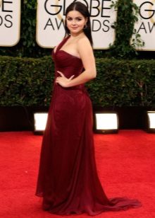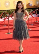 If there is excess weight, but at the same time the legs from the knee are rather slender, you can choose a shorter dress length.As in the second example of a bygone outfit from Ariel Winter. Tight-fitting dress case has a slightly loose, but straight, and not a widening cut from the thigh. Here, too, reigns minimalism, there are not only any decorative elements, but even the neckline: this length is simply obliged to balance modesty style.