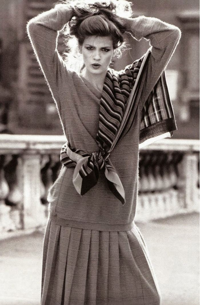 Gia Karanji looked the same organic and in feminine dresses and dresses a la dandy. Many trends of the time just now returned to fashion: diamond-patterned sweaters, woolen cardigans, long pleated skirts, black lace, bombers, Chanel-style suits and much, much more.