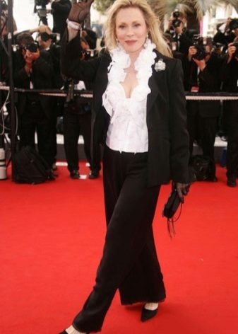 Another option is a pantsuit. The first is a combination of white and pastels, the second is a black and white set with a luxurious shirt with a deep neckline, decorated with frills.Both trouser sets consistently complete the classic pumps in the range of the ensemble.