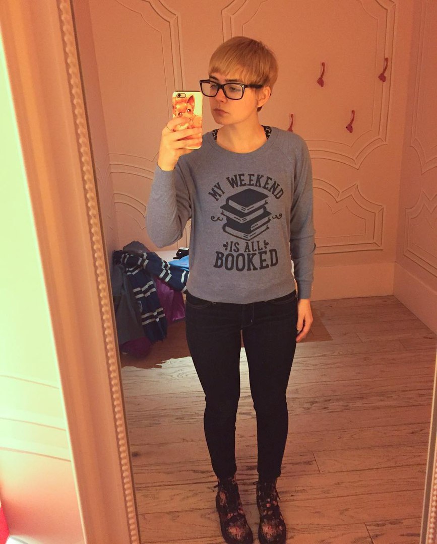 It would be strange if in the wardrobe of a girl obsessed with books, there would not be gizmos with a print on a favorite theme. Here it is. This lightweight sweater with a round neckline is fully in line with the fashion trends of street casual: the practicality of the cut, color, material, perfectly fit the figure. In place of black skinny could be denim shorts or even a knitted midi skirt with a straight cut.