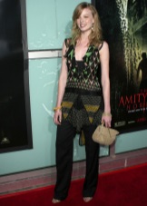Rachel Nichols knows how to be incredibly feminine even in trousers. And another confirmation of this is this beautiful image, consisting only of the original black trouser overalls. The model has a lowered waist line, a wide straight leg fit, a short sleeve and a total length of "to the floor." On the chest in the middle there is a satin strap vertically covering the buckle. Only the charming top button of golden color is open to eyes of those around.