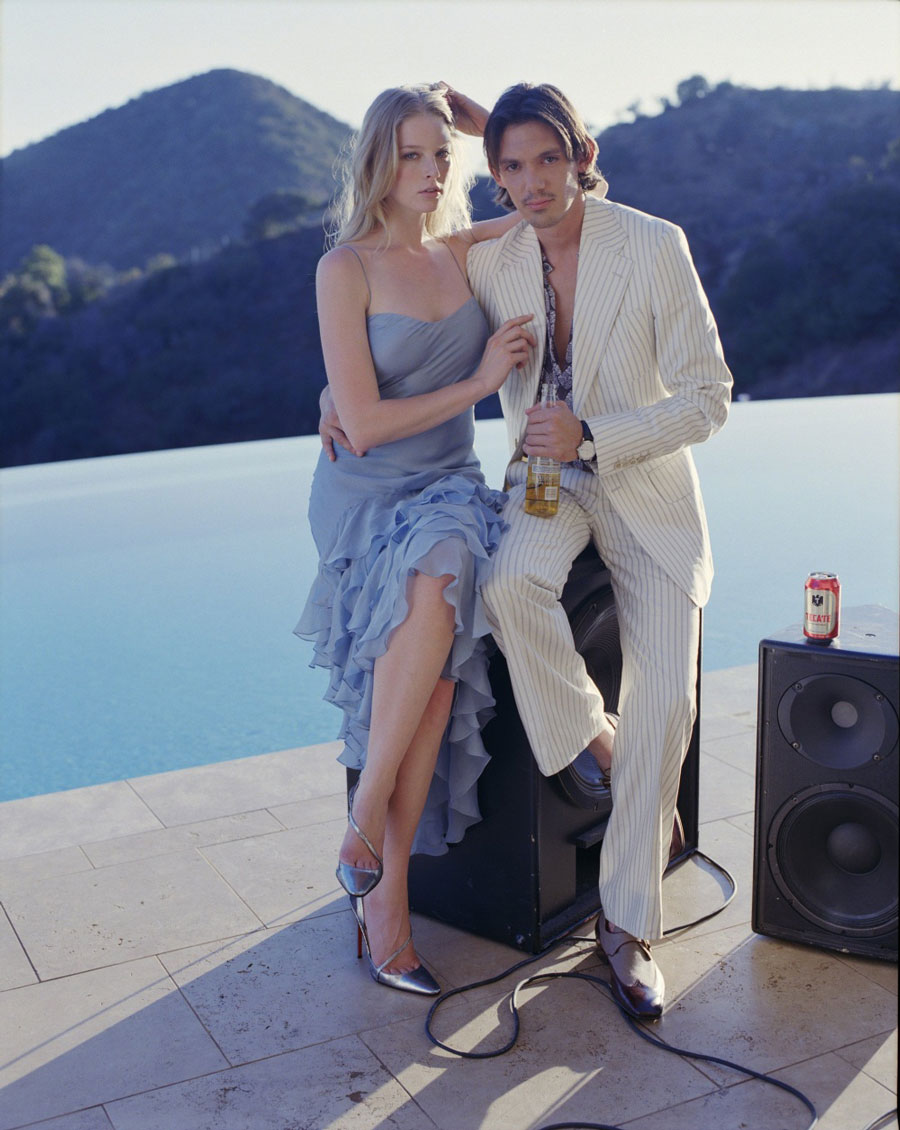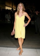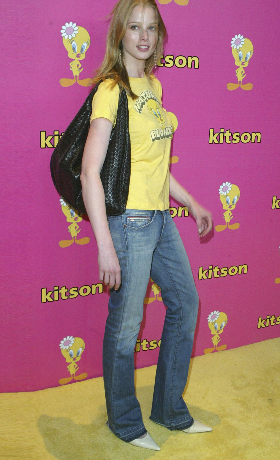 Who said that in such things as denim trousers, you can not appear at the official gatherings for representatives of the film industry? It is even possible. Especially if this event is focused on the presence of blondes. Why merge with the glamorous mass, if you can stand out from it perfectly? A bright yellow T-shirt with the logo of the event is combined in this image with simple flared jeans and pointy shoes - an image at the height of 2005 fashion, when it was actually demonstrated. The only thing that needs to be changed here is a handbag.