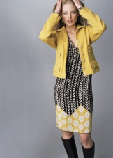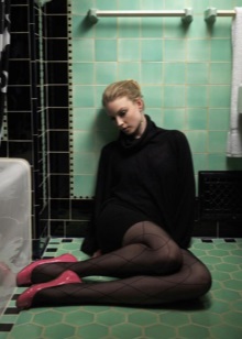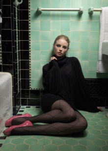 In addition to everything in this outfit, another very important technique is observed - two-color contrast. The main tone of the dress is diluted and emphasized by black - a ribbon, elegant boats, a large ring.