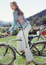 And the last image from the skin is also universal, because it is suitable both for a visit to a solemn event and for everyday life. Here, the centerpiece is the original tunic T-shirt: the geometric V-neckline is visually as if slightly “trimmed”, because the upper part is made of transparent fabric of skin tone. In contrast with the main gamut of the blouse - bright blue - it turns out very effectively. Additional geometric designs are outlined thanks to one very simple, but spectacular move: under the tunic, Rachel put on a white T-shirt. The bottom thing looks out from under the edge of the tunic, which also creates a more favorable in terms of style pattern.