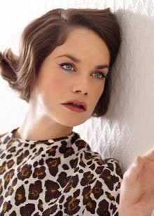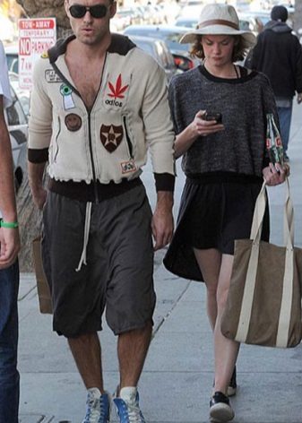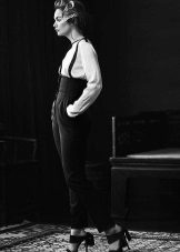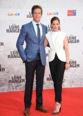 The image, which we consider next, is a very skillful combination of classic and modern. Before us again the three and shirt. At the same time, if the style of the jacket evokes memories of a men's suit of the XIX century, the trousers are made in modern traditions, and the color and texture of the fabric completely fade to futurism. The court shoe ensemble completes magnificently, their color scheme is almost the main note in the composition. The main tone of the shoe is solid, literally merges with the skin color of the actress, and the socks and heels are made in a bright coral shade, which is present in small patches and in the jacket finish.
