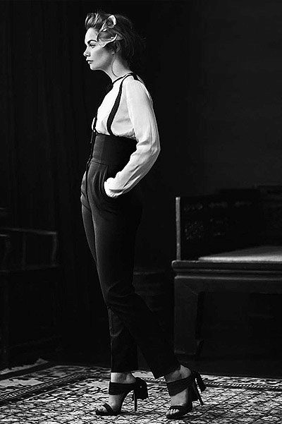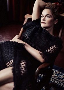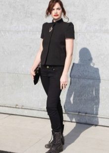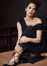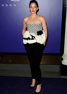 The latest trouser outfit from Ruth Wilson, which we will closely look at, is very feminine at all. There are two elements: classic trousers with arrows and a floor-length bustier dress with a slit in front of the waistline. Two colors in the ensemble - black and delicate shade of fuchsia. Accessories are minimalistic: classic pumps, a miniature clutch and a wide bracelet do not switch attention to themselves, but effectively complete the outfit.