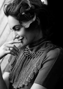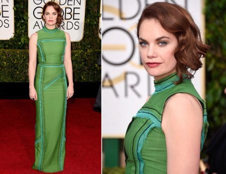 Our review is completed with the most successful and most effective outfit by Ruth Wilson in her entire career. The image is designed in the spirit of the cocktail of 1920-1930. Everything is perfect in it: a short volumetric hairstyle, natural make-up, an elegant dress in a floor of an elegant adjacent silhouette.The deep blue here is supplemented with pure white: on an impressive neckline, a flounce of a contrasting color is made. Complement the image of miniature bracelets.