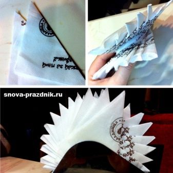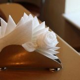 - Couronne. Un des schémas simples, basé sur les mêmes triangles de serviettes en neuf plis. Trois pièces sont posées avec le bord replié vers l'intérieur et trois autres sont ajoutées au centre. Vous pouvez en prendre plus, la condition principale est la symétrie des dents.