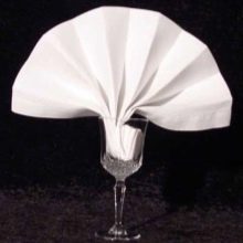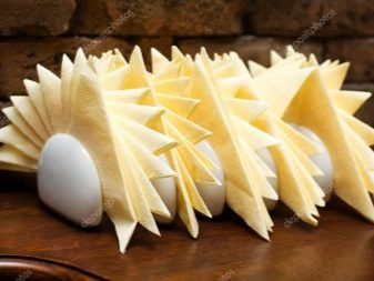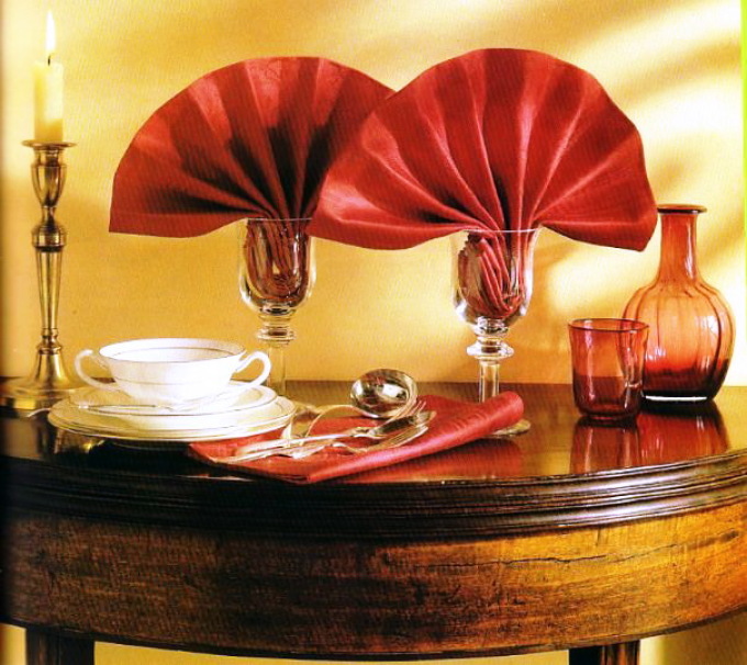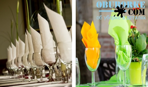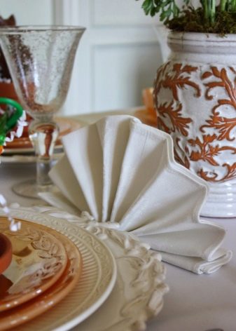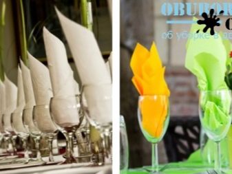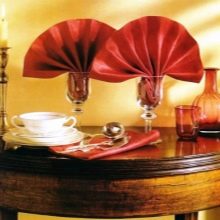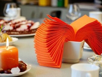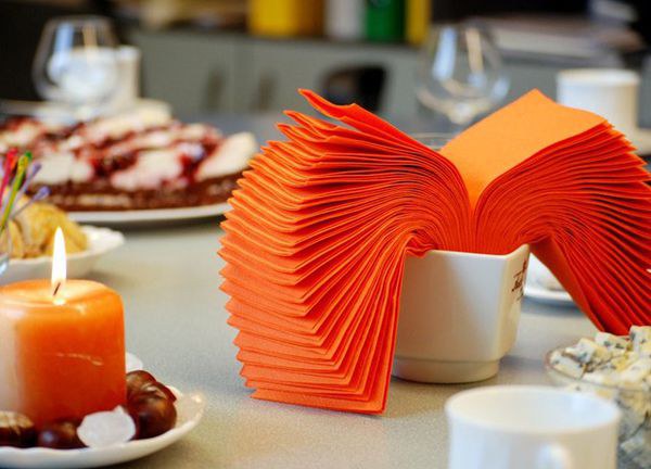 Outre la fonction décorative, les serviettes jouent un rôle très important: garder les mains et le visage propres. Par conséquent, quelle que soit la beauté de la composition des produits en papier, vous devez l'utiliser si nécessaire. En règle générale, elles sont combinées avec des serviettes en tissu, qui sont placées sur les genoux, tandis que des serviettes en papier sont placées sur la table dans des supports spécialement conçus.