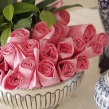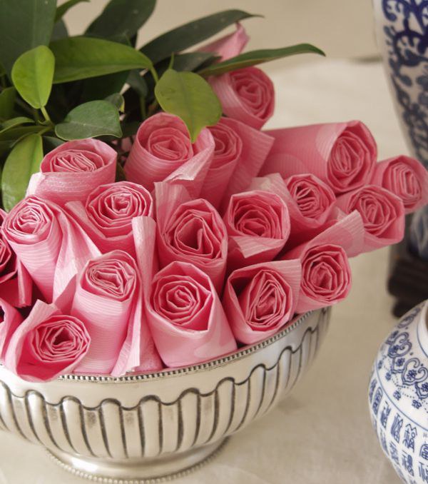 - Les roses résultantes doivent être placées dans un récipient approprié. Vous pouvez faire des feuilles avec des serviettes de table vertes, mais même sans elles, les fleurs ont un aspect spectaculaire.