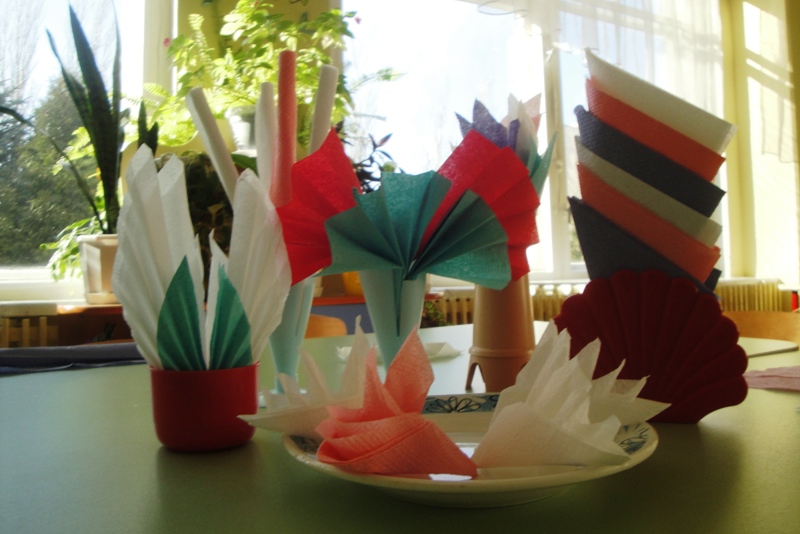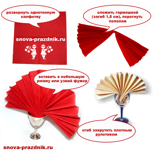 Dans un gobelet en plastique ou en verre ou dans un autre récipient bas rond à col large, vous pouvez plier les serviettes de la manière suivante: