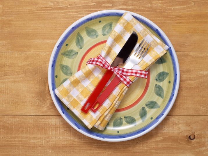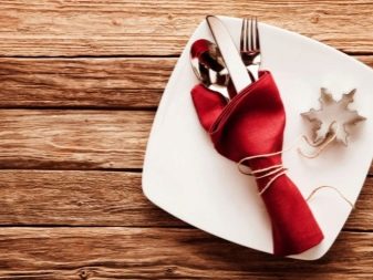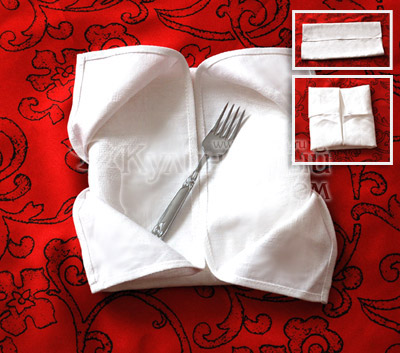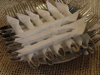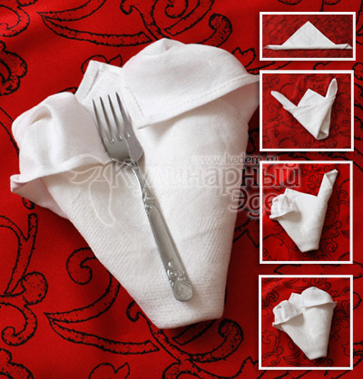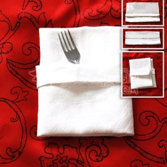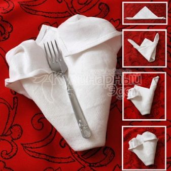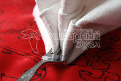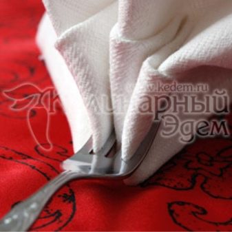 Décorer délicatement la fourchette permettra une serviette en tissu bien positionnée. Pour commencer, il doit être plié en diagonale, puis plier son bord inférieur de 2 cm et faire plusieurs plis qui doivent être tirés à travers les dents de la fourche. Après cela, la vaisselle décorée peut être posée sur une assiette ou à proximité.