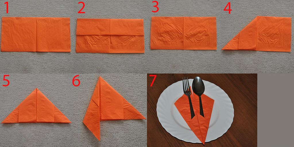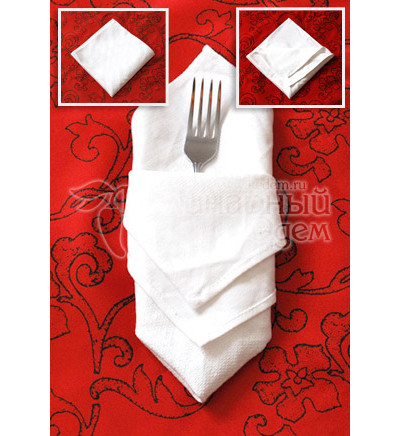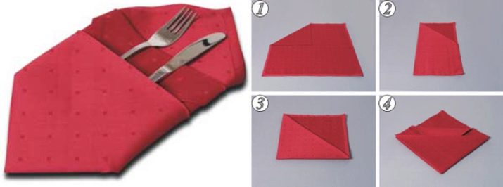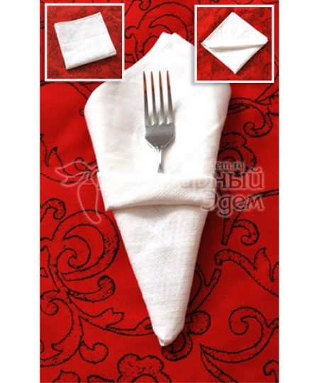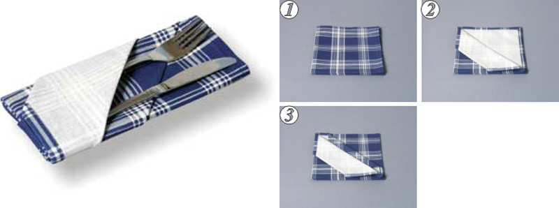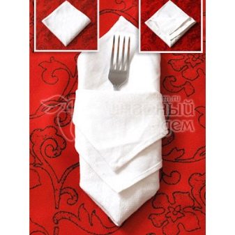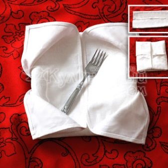 La solution classique pour plier le tissu est le «sachet diagonal», qui a apparemment beaucoup en commun avec l’enveloppe. Cette option comprend des poches séparées pour chaque couverts. Vous devez déplier la serviette et la plier exactement en deux, alors que ces actions doivent être effectuées verticalement, puis en diagonale.Le résultat est un carré dans lequel vous devez plier le coin supérieur droit, puis le déplacer vers le coin inférieur gauche.