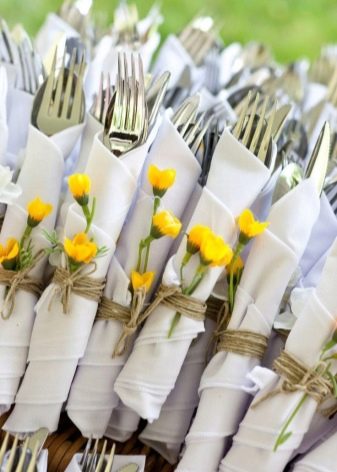 Une autre façon de créer une couverture de service en tissu qui non seulement paraît inhabituelle et attrayante, mais qui convient également à la décoration d'un banquet en plein air. Pour le faire, vous devez suivre les étapes suivantes: